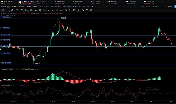 以太的反弹徘徊在2400附近,这个位置也是高位,日线布林带上轨压制区域,除非强势突破前高2455点,那么还有向上的空间,反之直接在2400附近空单,目标下看2300附近。