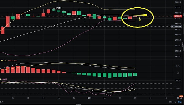 大饼达今年新高45500一线,以太坊也达2400一线,现在行情持续运行在小时线BOLL轨道中下轨区间,看小时线,点位始终未能突破BOLL中轨压制,MACD金叉但是拐头下行,KDJ运行在超买区一线,结合数据分析,午间操作建议高位看空。