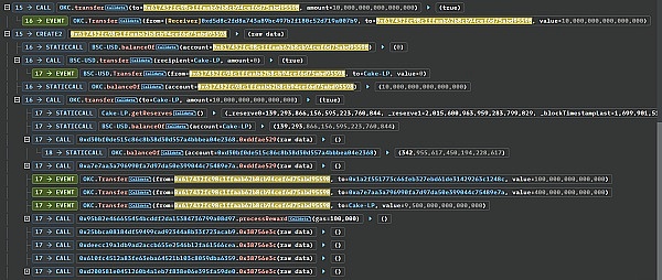 简单来说,黑客通过闪电贷借了大量USDT,并兑换大量OKC,从而拉高了OKC的价格。并且由于OKC项目未设置LP奖励发放的锁仓要求,所以黑客在获取奖励后立刻撤回流动性,从而获取了项目方发放的流动性提供者的奖励。并将OKC项目方奖励的OKC Token出售。最终获利 6,268 USDT。