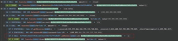 然后黑客使用主要的攻击合约对 PancakePair_USDT_OKC 池子添加流动性操作,得到约 225,705 个LP Token。