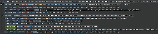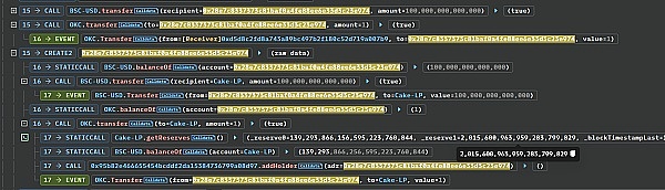 故攻击者通过使用大额闪电贷资金进行买入OKC,导致 OKC 数量减少,从而拉高了 OKC Token 的价格,将 1 OKC = 0.3 USDT 的价格提升到 1 OKC = 68.9 USDT。