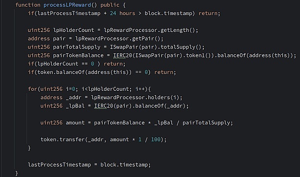 通过攻击分析得知,黑客主要获利资金是由 MinerPool 合约中 processLPReward 函数,该函数逻辑主要是获取 lpHolder 并根据其 LP 数量直接按比例进行奖励。