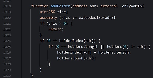 从该处逻辑可以看出addHolder函数中使用了 extcodesize() 来计算地址当前的大小,用来判断地址是否是合约地址,但是在攻击者通过 CREATE2 创建合约,由于合约在初始化时,该地址大小依然为0,从而来攻击者在其构造函数中调用该函数绕过其中的合约调用限制。