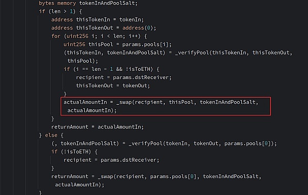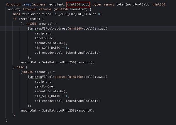 深入 _swap 函数,查看具体兑换逻辑,此处的内部兑换函数在调用外部传入的 pool 池子进行代币兑换后,未对兑换后的资金进行校验,直接使用 pool 返回的兑换金额进行下一个路径的兑换操作,从而导致攻击者构造假的 pool 合约并直接在swap函数中返回当前TransitSwapRouterV5 合约自身的USDT储备,进而造成合约资金被拿去做第二次兑换,最终使攻击者获利。