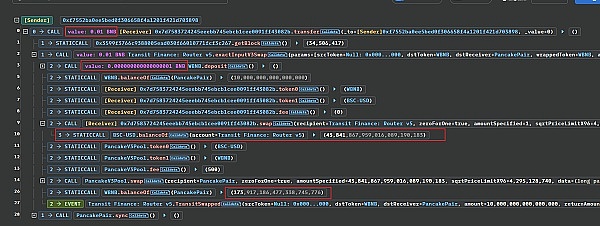 黑客通过 TransitSwapRouterV5 合约的多路径兑换功能将 0.01 BNB 成功兑换了约为 173.9 BNB ,如下图:
