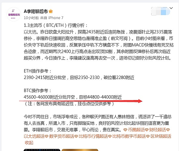大饼。如李隆早间所说,45600附近直接去空,晚间一举跳水触及40300附近,盘中目标成功扫盈,可谓大跌眼界,空头走出5000余点的把握空间,实力番苍,全网见证!点位依旧精准吻合,盘中理性稳健取舍。李隆聊后市,交易无难事,平心而论,贵在真实。