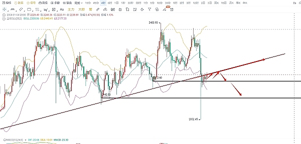 四小时以太坊行情来看,价格在昨日下午进行一波瀑布式的下跌,从最高2385附近迅速下跌,最低是插针到了2050附近,后实体是收在了我们上行趋势线的下发,且延伸着上行趋势线缓慢向上,形成多次试探上行趋势线的压制,如果上行趋势线能够经住考验,那么我们可以延伸上行趋势线去选择我们的空单。