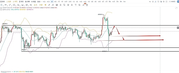 四小时比特币行情来看从昨日的瀑布行情后价格并未有太大的走势,而是形成了宽幅震荡都走势,从布林带来看目前是处于一个开口的形态,价格且处于中轨下发运行,上方44000压力位刚好也处于布林带中轨附近,那么我们目标相对就比较明确,可以在压力位附近高位做空。
