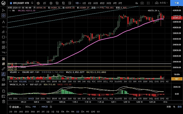 大饼昨日走势与思路一致呈震荡上行,最高触及44733一线受阻回落,行情插针最低跌至42500一线支撑反弹,目前币价在43600附近运行,四小时级别行情震荡上行后受阻k线收长上影,向下插针又迅速反弹拉回43500上方,但走势来看还有下跌需求,关注ma200均线能否撑住,若破位则会再探前低,守住的话预计会走震荡上行,日线级别底部抬高整体处于一个上升通道内震荡,盘面来看多头依然强势,不破4w仍逢低做多为主高空为辅,上方压制44300-44700,下方支撑43000-42500