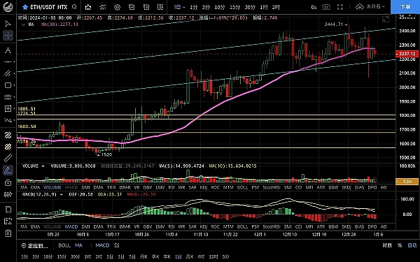 以太坊走势与大盘联动但整体比大饼弱势,最高反弹至2294一线受阻回落,低位跌至2212支撑,昨日多单获利90点恭喜跟上的朋友,目前币价在2240附近运行,四小时级别行情两次触及ma90均线都没有突破可见阻力比较强,macd空头运行双线死叉,k线大阴回落,短期走势偏向空头,关注12点若收线在ma7下方则还有下行空间,反之则会再次去试探90均线,日线级别整体一直在通道内运行,上下支撑压力都强没有效破位过,当前走势偏向回落,建议回踩后再逢低做多,触及阻力可以做空,上方压制2275-2300,下方支撑2210-2180