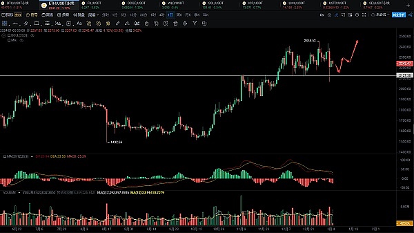 以太日线反弹到布林带中轨开启向下,均线压制K线向下运行,以太还要回踩下方布林带下轨区域,如果止跌才会开始向上拉升行情。以太建议2245—2250附近空单,下看2150—2100.