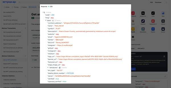 这里我们通过接口 Get an NFT collection“/v2/collections/{contract_address}”检索合约地址为 lat1qjwjv237chk0nhv7xevumjf0g3wtcm73hqv9al Name 为 Plato_World 的 NFT Collection 详情信息,返回的每条数据包含 32 个 data: