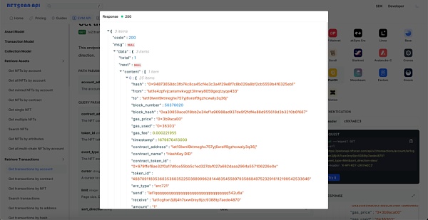 Transactions API:交易模型代表了区块链上一个 NFT 资产的全量交易数据,为开发者提供 NFT 的完整生命周期交易信息。包括 NFT 的 mint、转移、销售、和其他交易活动,为开发者提供了深入了解 NFT 资产在 PlatON 生态系统中的流动和演变过程的机会。NFTScan 不断地汇总来自各个区块链网络的 NFT 交易市场和相关交易合约信息,目前 NFTScan 已收录用于追踪和了解 NFT 市场的动态,同时也有助于开发者构建基于 NFT 的应用程序和工具。
