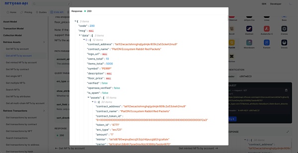 点击 Try it 数据响应结果:该地址下一共持有 3 个 NFT Collections,分别是 PlatON Ecosystem Rabbit Red Packets、SA NFT、HashKey DID,按 floor_price 降序排序,返回数据包括每个 NFT contract 地址以及 name,持有数量及该 contract 地址下 item 数量,地板价以及一些的基础细节信息描述等等。
