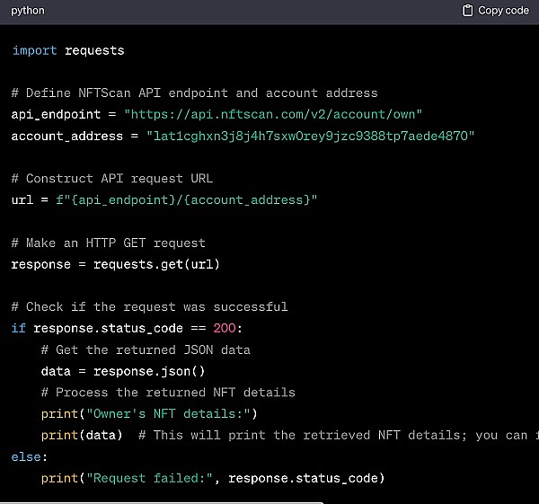 当开发者在 NFTScan 的 API 文档中找到所需的 PlatON API 接口和参数后,可以使用他们选择的编程语言(例如 Python、Java、JavaScript 等)来编写 API 请求代码。以下是一个示例,演示如何使用 Python 来请求一个钱包地址持有的 NFT。