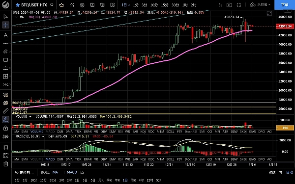 大饼昨日最高反弹至44300受阻回落,低位跌至43100一线支撑且再次反弹,恭喜跟上昨日思路的朋友多单获利1000点,目前币价在43880附近运行,四小时级别回踩底部逐渐抬高同样反弹高点也在降低,整体处于大跌之后的震荡修复阶段,macd无量运行双线粘合走平,短线走势较为平稳没什么太大变化,加上周末原因行情缓慢,预计不会有太大波动,以区间震荡为主,大方向依旧是多头趋势,周线呈高位震荡回踩力度不大,后续有再次走高的可能,日内思路建议区间内高空低多为主,上方压制44300-44700,下方支撑43300-42500