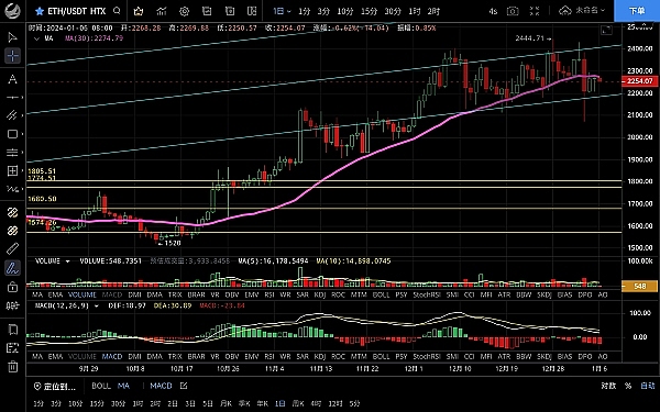 以太坊昨日与大饼一致呈回落反弹 走势,昨日低位跌至2206一线后支撑反弹,高位触及2275一线受阻,恭喜跟上昨日思路的朋友多单获利60点,目前币价在2253附近运行,四小时级别行情回落暂时承压于ma120下方,k虽线连阳反弹但没有突破迹象,macd多头运行双线金叉,但反弹力度偏弱,白盘预计不会有太大动作,整体方向来看后期还有上涨需求,耐心等待是最合适的,空头力度逐渐缩减,若给到机会可以逢低做多等待起飞,周末空间不大可以观望或短线高空低多,上方压制2275-2300,下方支撑2210-2180