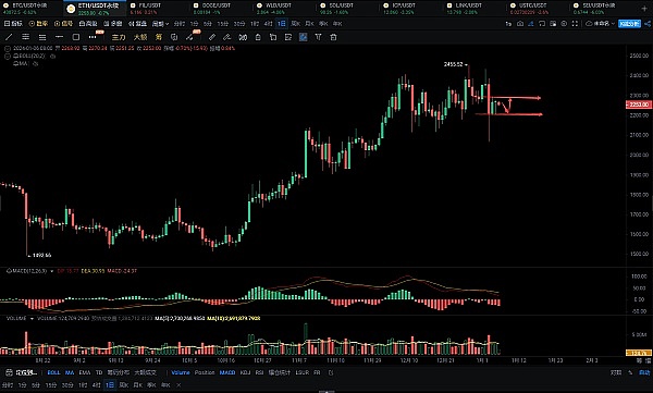 以太走势跟随大饼,只是以太反弹的力度不够,日线级别支撑在布林带下轨附近,MACD指标在向下发散,空头量能放大,建议以太2250附近现价空, 目标2200附近;2200附近尝试多单,目标看2300附近。操作严格带上风控,根据个人习惯设置。全网公开,思路清晰,点位精准,欢迎点赞评论。单丝不成线,独木不成林,与其一个人的单打独斗,还不如选择跟随,用众人之力,则无不胜也。
