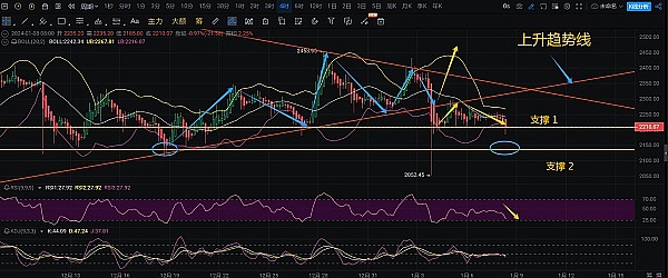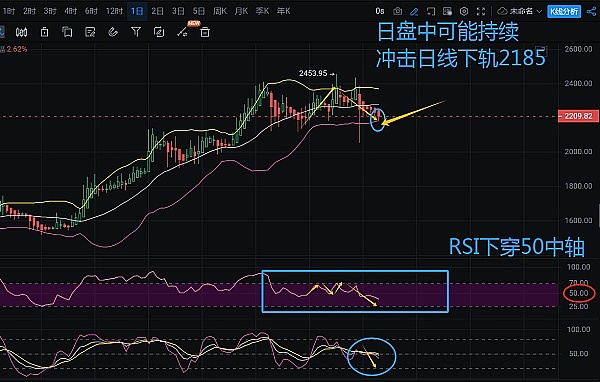 那么当前4小时基本面,价格走势弱势形态较为明显了,如图,当前价格跌破上升趋势线,到达第一支撑位2215附近,那当前是否在2215附近能够形成支撑反转吗?我觉得可能性不大,因为4小时RSI指标趋势线当前下行穿过中轴50值到达了25附近空头区间,那么相应的做空势能仍将深化,即使盘中没能出现放量杀跌连续破位下行的形态。也是反弹无力窄幅震荡走低。下方2150附近恐有破位到达风险