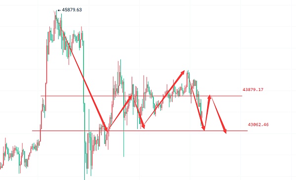 比特币周线收取阳线之后价格有一定的下跌,且周线头多力量有明显放缓,整体周线并不是非常的乐观。日线在震荡下跌三连阴之后,早盘时间段就开始放量下跌,KDJ三线交叉向下形成死叉,日线空头力量加速运行,日内还有进一步试探底部支撑43000左右。短线四小时上布林有开口迹象,43800已经形成顶底转换,空单布局处理建议关注这个位置。一小时上短线boll开口价格运行在下跌通道之中,下方支撑建议关注42900处理,多单不布局建议关注这个位置。综合上述比特币日线建议区间操作为主。