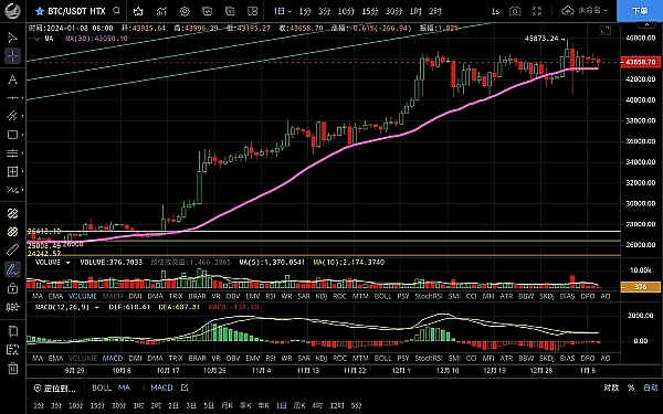 大饼昨日最高触及44500一线受阻回落,随后行情震荡下行低位跌至43195一线支撑,恭喜跟上思路的朋友,目前币价在43600附近运行,四小时k线连阴macd转空头双线死叉向下运行,ma7拐头向下,上方阻力明显多头未能突破,短期走势偏向下行,下方先关注42800支撑情况,不破可进多单,日线级别整体仍是震荡走势,短线区间在42500-44500,目前方向并不明确,重点关注10号的消息面影响,日内操作建议高空低多对待,上方压制44000-44500,下方支撑43000-42500