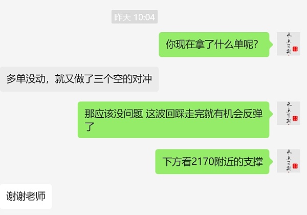 昨天长路在文中和视频中都给出了,行情回踩日线中轨会有一波反弹,实时策略也给出了回踩2170附近可以做个防守多单,有做多单的朋友,长路也提醒多单不要紧,关注2170的支撑,走完这么空单就有机会反弹。恭喜跟上长路操作的朋友。
