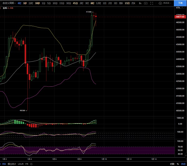 近一个星期有点事,未做详细的分析,嘘寒问暖的话不多说了,咱们看看昨日行情,昨日币价再次给到4千点的涨幅,新高再度被突破,行情再度拔高也是受ETF利好消息面的影响,目前涨幅已经有所止步,行情不会一直涨,也不会一直跌,短线高位有所停留,那么结构上还是有回落的预期,高位不追涨这是基本原则。考虑到滞涨表现明显,操作上还是以回调做多的思路去操作!那么我们看看盘面走势情况