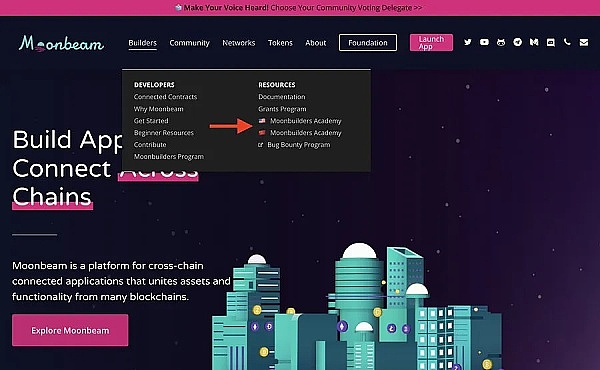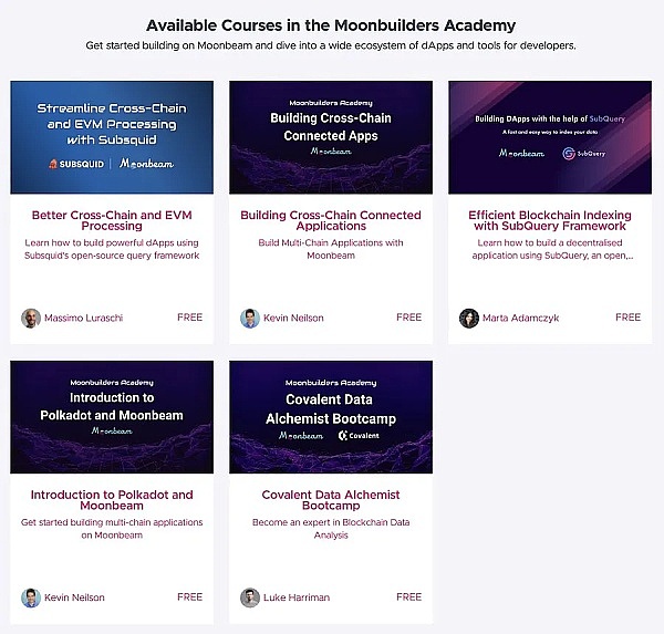 Moonbeam团队于2022年宣布开放Moonbuilders Academy。这是一套以开发为中心的异步学习课程,用于学习如何在Moonbeam上构建跨链DApp。