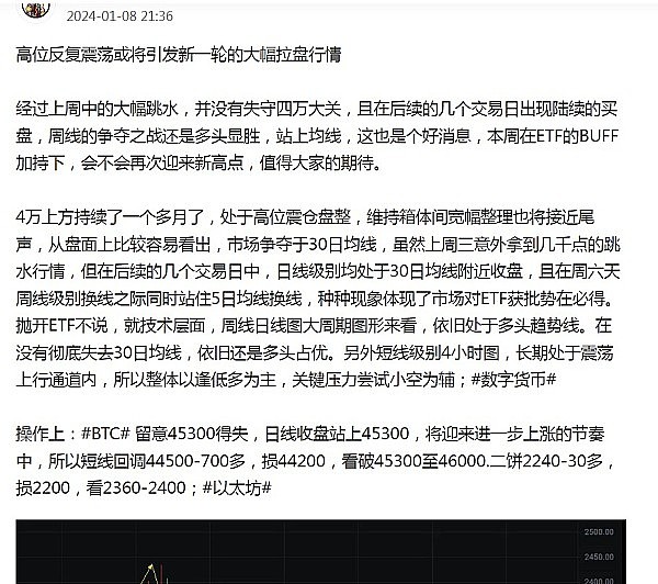 周一的大幅拉升刷高势在必得,不管是基本面还是技术面都偏向于向上突破,顺势而为就成为理所当然,水到渠成。昨天44700激进布局开多,看破日线布林带上轨,迎来新高47300.恭喜所有严格跟随的铁子们,新年开局比较给力。我相信2024年你们都不会太差,也相信我们会在顶峰相见,愿2024年大家都有好的收获!