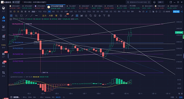 4小时线,昨天回踩下方下跌趋势线反弹,长路昨天在视频中就有提到,可以关注下方斐波那契回撤线0.5处2250附近的支撑,没有想到插针会到2217附近,而反弹后突破了上方下跌趋势线的压制,刚刚打到上方上涨趋势2400附近回踩,下方可关注斐波那契回撤线0.786处2355附近的支撑,若是跌破则继续看行情回踩,今天操作上长路建议先看回踩,大家在操作的时候一定要带上止损,因为随着ETF消息面的到来,可能会走出极端行情。带上止损以小博大。
