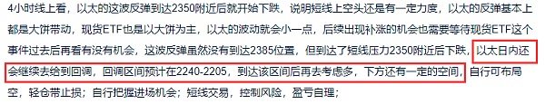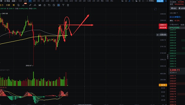 以太的走势就没有大饼那么妖,中规中矩的走势,下跌到目标区间,然后走出反弹,反弹走一波突破收上影线,日内行情还是有下跌的机会,现货ETF对大饼的影响会大一点,以太只是被动拉升,日内交易上以太会有下跌,下跌区间预计在2290-2260,有几十个点的空间,可以自行把握一下,到达下方区间后就持有多单等待消息面公布拉升即可,自行把握进场机会;短线交易,控制风险,盈亏自理;