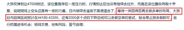 4小时线上看,大饼这跟线是市场消息面影响,快速反弹后再快速下跌,现货ETF今晚也是明天凌晨5-6点预计就会获批,从假消息上就能看出获批后对市场的影响,晚间交易上,我们尽量去做低多,但从白盘的走势上看,大饼白盘还是有下跌的机会,白盘大饼预计还是会有一波小回调,回调点位预计在43200附近,跌破就会往41900附近去了,白盘跟昨日一样,也是可以去做空单的布局,注意轻仓带损,下方还有3000个点空间,有利润就自行把握机会出局,也可等下跌后再去多,下方支撑点位在43200-41900,到达后开多了就可持有到现货ETF获批,后面的行情不出意外就是上涨了,自行把握进场机会;短线交易,控制风险,盈亏自理;