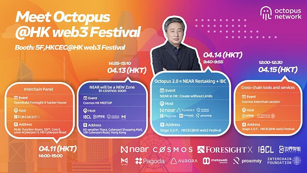 4月14日,章鱼网络在 HK Web3 Festival 上公布了 Octupus2.0 。章鱼网络创始人 Louis 受 NEAR 邀请,作为2023香港 Web3 嘉年华 NEAR Event 主题演讲嘉宾之一,围绕「NEAR Restaking」和「Adaptive IBC」讲述 Octupus2.0 架构和实施计划。