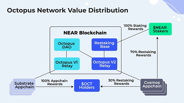 章鱼网络 2.0 主网,如图 Octopus V2 Relay 部分:进一步支持 Cosmos SDK 应用链。增加了 $NEAR Restaking 机制,将可提供的安全性等级提升到十亿美元级别,让 $NEAR 的持有人的一份 $NEAR 资产为 NEAR Protocol 质押后,还能为以 NEAR 为枢纽的应用链或者 NEAR 生态的中间件做质押,获取多重的质押奖励。跨链方面在 1.0 的基础上,NEAR-IBC 的上线让 NEAR 与 Cosmos 生态可以直接跨链互操作,让区块链互联网的互联互通的范围和体验,再上新台阶!