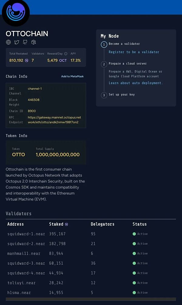 2023年12月17日,章鱼多链网络生态第一条 Cosmos SDK 应用链 Ottochain 正式启动。截止发稿日,参与质押超过 80 万个 $NEAR。