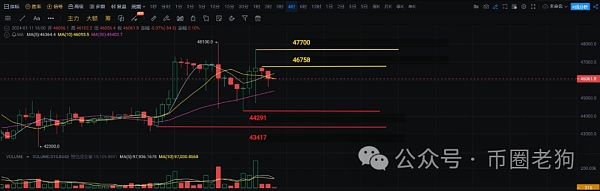 短期大饼价格如果上涨,上方首先要关注46758是否突破,如果四小时级别大饼收线涨穿46758,短期大饼有机会继续向高点进发。