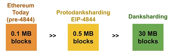 相比之下,目前以太坊每个区块可以容纳的数据大小不到 200KB,引入 blob 后,以太坊区块可容纳的数据量将显著提高。