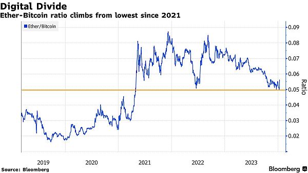 对比特币ETF的炒作导致2023年以太币的表现有所落后。本周初,以太币相对于比特币的价格比率处于2021年以来的最低水平。此后,由于以太币最近的上涨,该比率不断走高。