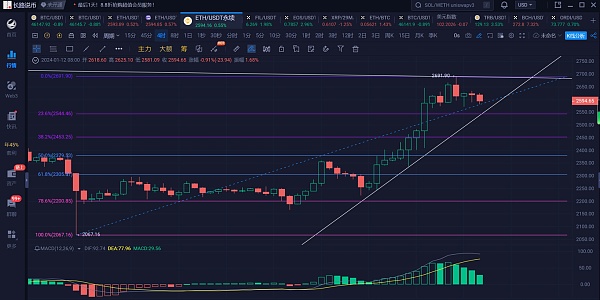 4小时线,行情连续反弹走出2691高点后回踩,现行情一直围绕2600附近震荡运行,多次测试2570附近的支撑并未跌破,从技术面上看,MACD绿色量柱缩量有走出死叉的趋势,其他技术指标同样是向下的走势,那么可关注到行情回踩再次去测试下方上涨趋势线的支撑2565附近,若是跌破,那么才有机会去看下方斐波那契回撤线0.236处2545附近,而经过昨晚的一大波反弹后,尤其是ETF并没有出现大涨的情况甚至破发,那么我相信将会有一段震荡整理期,修复行情过快带来的弊端,今天操作上可先关注行情震荡回踩,在没有跌破下方大阳线的这段时间,大家尤其是喜欢做空的朋友一定需要更加谨慎。