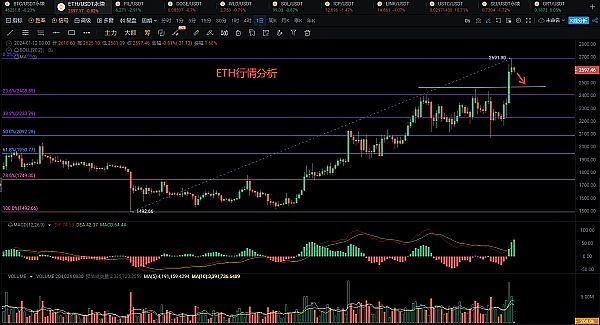 以太走势和大饼同步,2700点短期至少是一个高点,日线破位布林带上轨,按照正常逻辑他是要回到布林带轨道内,所以今天同样看回落,建议2600附近空单,目标看到2500附近。