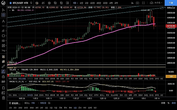 大饼文中提及切勿追高规避了风险,昨日行情整体呈震荡下行,晚间空头发力加速下跌最低至41390一线支撑反弹,恭喜跟上思路的朋友空单大获全胜,目前币价在42790附近运行,四小时级别k线连续收长上影可见上方阻力较强,随后九连阴走出一波大幅回撤,macd空头逐步放量双线死叉向下,ma7拐头下穿多根均线形成死叉,可见空头力度较强,短期收针反弹但力度不大,加上周末行情缓慢,预计走震荡修复的概率较大,日线级别如思路一致跌至ma60支撑反弹,多头暂时告一段落,后市行情会震荡下行或持续宽度震荡,关注周k若收阴下周将逢高做空为主,日内建议高空低多对待,上方压制43500-44300,下方支撑42000-41400