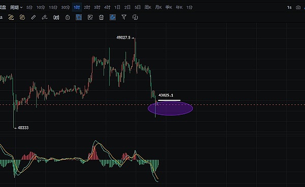 大饼。果不其然,连日ETF消息通过应声大涨,昨日晚间出现抛售恐慌,主力洗盘加剧,早间更是跌至41000关口附近,单边浮动达5000余点,李隆昨日强调的吃空点位更为精准了结,惋惜以太形同陌路打到止损。目前小时图来看,币价反复插针破位之后有所调整,BOLL通道向下极端开口,虽小级别修整43000附近,但整体结构依旧薄弱,附图macd快慢线死叉增量,今日周六,李隆建议短空看待即可,进场切记做好分批风控计划。