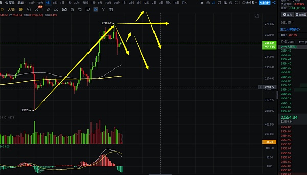 4小时线上看,以太的下跌力度相比大饼来说就差一点,没有给到很大的下跌,只是打破了前面上涨的走势,大饼短线上会走反弹,以太应该不会再跟大饼反着来,以太短线也是会有反弹空间,就看一以太的拉升力度了,如果大饼持续反弹,以太只给到小反弹,以太短线的压力在2665附近,大饼到46050-47350区间,以太才到2665附近的话,空单杀进去就完事,后续就是大暴跌,若以太多头强势,突破2718,那就看3000附近去了再去空,短线上多单问题是不大,关注高点压力以及高点破位即可,自行把握进场机会;短线交易,控制风险,盈亏自理;