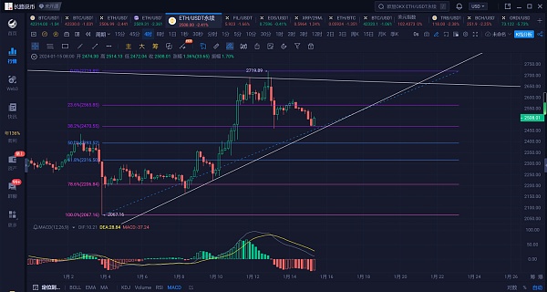 以太坊行情分析:上周行情走出长上影线大阳柱,插针2715高点回踩,随着坎昆升级的临近,以太坊走势也相对于比较强势,而大饼因为ETF利好也走出了49000的高点,但是多支ETF上线及破发,让众多投资者进场就成为大股东,感受到来自币圈的温暖。而日线方面以太走出长上影线阴柱后,昨天又走出大阴线跌至10日均线处才止住跌势,从技术面上看,MACD绿色量柱仍处于缩量状态,其他技术指标有反弹的趋势,若今天反弹不能修复昨天大阴线的一半,那么行情仍将会以空头为主,下方则需要继续关注2470附近的支撑。