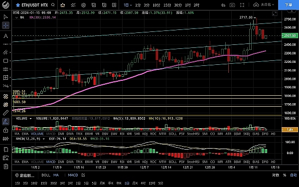 以太坊昨日最高反弹至2589一线受阻,随后整体呈震荡下行走势,早间空头加速下跌至2460一线支撑反弹,恭喜跟上思路的朋友,目前币价在2500附近运行,四小时级别行情整体处于ma7均线下方运行,k线连阴回落再探前低,短期虽暂时止跌,但反弹力度较弱,macd空头运行双线死叉向下,上方先关注ma7均线压制,预计突破的概率不大,日线级别多头逐步缩量,短期走势偏向空头,若收线在ma7下方预计会去试探ma14均线,反之收线在ma7上方则多头未被打破还有上冲的可能,白盘思路建议高空低多对待,上方压制2530-2570,下方支撑2460-2400