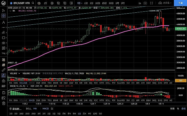 大饼这个周末波动不大如思路一致成震荡修复走势,凌晨行情下跌再探前低至41720附近支撑,恭喜跟上思路的朋友,目前比价在42250附近运行,四小时级别行情震荡后选择二次下探但未破前低走出反弹,macd空头无量运行双线呈粘合状态,ma7向下指引,短期指标虽偏向空头但从盘面来看,以到达支撑区域,先关注反弹力度,预计不会太大,日线级别价格再次跌至ma60均线虽有反弹但走势还是较弱,macd空头逐步放量双线死叉向下形成顶背离结构,若破位预计会试探4w关口,日内思路建议高空低多对待,上方压制43000-43500,下方支撑41500-40000
