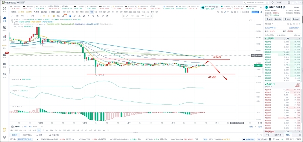 我们再回到比特币的具体盘面当中来,现在可以看到非常明显,行情进入了一个横盘调整的周期,并且在下方的41700附近收到短线支撑,按照这一点,实际上我们操作的思路就已经出来了,短线上面你就重点关注41500~4 3600这样的一个区间,给到位置高估低渣即可,我在前一段时间的直播当中一直说我不建议去追单子,对吧?然后在这一波行情当中,反而我是觉得我给到的这两个位置,假如说任意方向破位了,都可以去小追一下,然后带一个原地止损就可以了。只要破位了,至少1000个点的空间是会有的。其实最近的行情都是以横盘插针的情况比较多,所以在具体的进场位置上面没有太多可讲的,如果说对于操作上有问题的币友,也欢迎随时找到全网找币胜团。