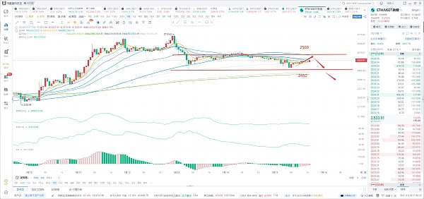 然后在以太坊的盘面当中来看,实际上可以说跟比特币走出了不一样的走势,这也是受到以太坊后续由坎昆升级预期的影响。长线屯币的我刚刚也讲了,2100这个位置给到就可以开始买入。作为短线操作的朋友来讲,我也给一个我个人看好的区间。上方关注2560下方关注2450,给到就可以选择高估低渣。然后只要出现破位行情,可以选择去追单,追单的空间把握80个点,然后同样的带好止损。从盘面上来看,实际上行情早就是想下跌的,只是受到以太坊的托盘导致山寨整体的走势还是维持着在。如果一旦以太坊行情开始出现下方破位,持有山寨的朋友一定要第一时间溜,不管你是赚钱的还是亏钱的。