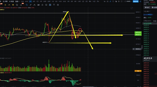 4小时线上看,大饼短线这波下跌到达支撑42100附近后收长下影线,虽然行情是周末,但是周末过后如果是多头强势就要开始发力了,但多头并未发力,还走出一波实体下跌再次试探短线低点,上方还有200日均线压力,整体走势上看,大饼多头的力量有点不足了,上周周线收线也是触及到压力后收长上影线,大趋势也是处于空头,日内短线上我们转换思路,开始做空,白盘压力43560附近,可围绕该位置做布局,下跌开启,40207低点是守不住的,跌破后到达点位在38000附近,自行把握进场机会;短线交易,控制风险,盈亏自理;