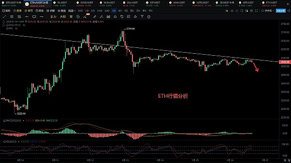 以太的压力区间在2540—2550附近,这是小级别的波动,目前来看以太的反弹呈现走低,趋势还要向下回落,小时线级别KDJ出现死叉,建议以太2540附近空单,目标看到2480—2450.